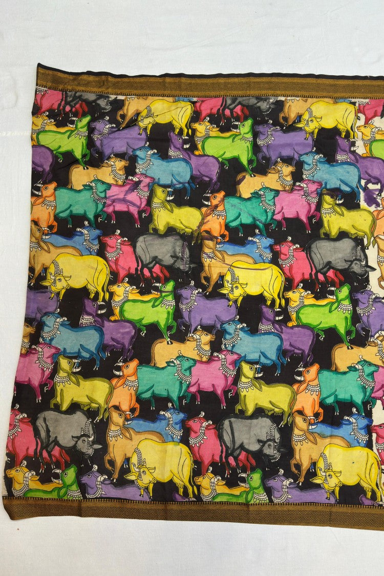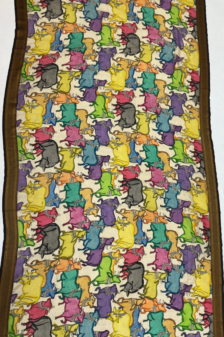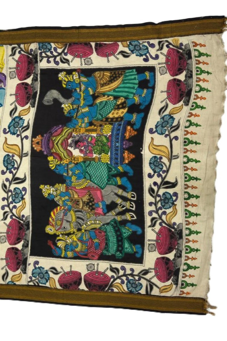 Nellore Silk Srikalahasti Pen Kalamkari Saree with Nizam Border with a contrast running blouse piece. Experience timeless elegance with a masterpiece of traditional artistry and royal aesthetics. Hand-painted meticulously using a traditional pen technique, this saree showcases intricate Kalamkari motifs created with 100% natural colours, making each piece truly unique and eco-friendly. Each saree is a wearable canvas, featuring intricate motifs inspired by mythology, nature, and heritage art forms. The fine pen work brings unmatched detail and depth, making every piece truly one of a kind. The detailed storytelling motifs paired with the royal border make this saree perfect for weddings, festive celebrations, temple visits, and special occasions.