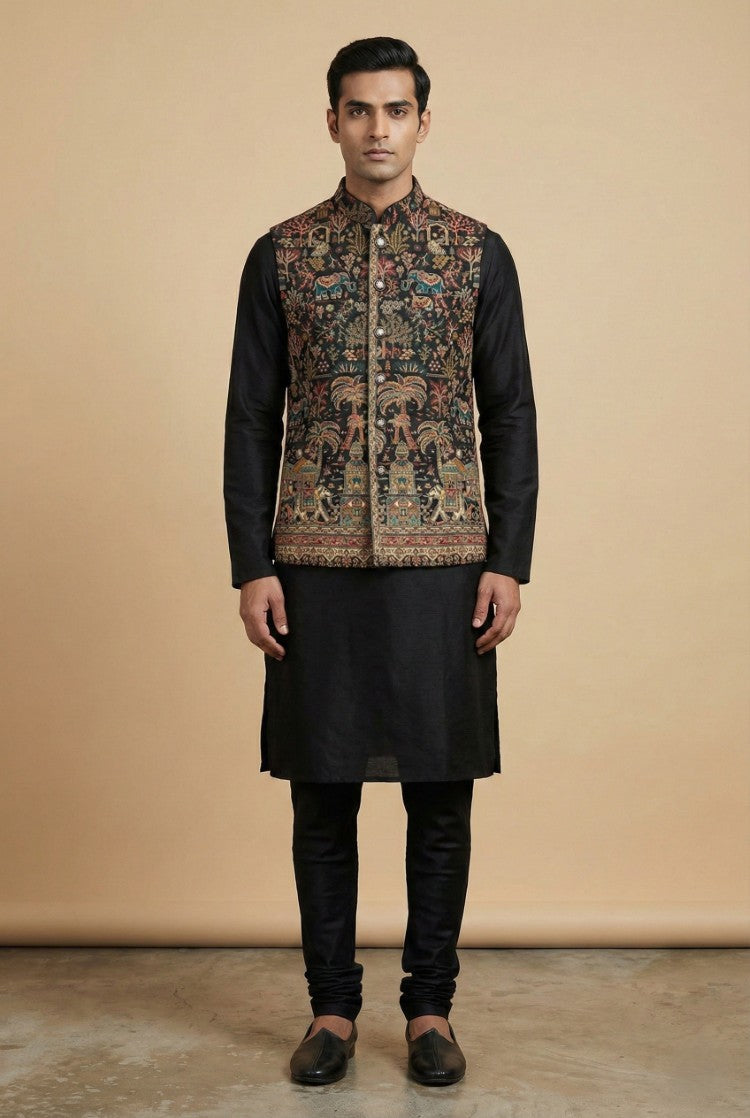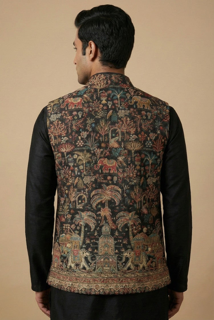 Crafted from rich jacquard fabric, this jacket draws inspiration from classic pashmina motifs, lending it a subtle texture and understated elegance. The structured Nehru silhouette offers a sharp, regal look, making it perfect for festive occasions, weddings, cultural gatherings, and formal celebrations. Designed with both style and practicality in mind, the jacket features one chest pocket for a pocket square or accent detail, along with two discreet inside pockets to securely carry essentials without compromising the clean silhouette.